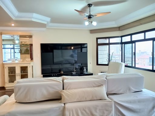 Lindo apto 1 por andar sendo 4 quartos claros e arejados onde 1 foi transformado em um closet gigante e lindíssimo com fino acabamento luzes internas conta com 4 suítes todas lindas modernizadas e impecáveis tudo aquecido com aquecedor a gás e ar condicionado central para climatizar todos os ambientes 1 sala de TV aconchegante 1 sala gigante para até 4 ambientes com 1 lavabo e também contando com uma lareira e vista para o mar toda fechada em vidro no espaço ao lado temos a área gourmet com uma bela churrasqueira e espaço para chopeira etc... 1 espaço para uma bela mesa de jantar, temos uma cozinha lindíssima com balcão climatizada com fogão e forno embutidos, geladeira duplex também embutida além de armários de muita qualidade e bom gosto .Temos 1 grande área de serviço com despensa e banheiro para empregada com entrada de serviço com porta blindada ,trava de elevador privativo aquecimento total do apartamento.4 vagas demarcadas privativa coberta do apartamento .Prédio conta com 2 elevadores câmeras de segurança portaria 24 horas ...Excelente localização próximo de bares restaurantes comércios no geral shopping Sesc etc..... venha conhecer