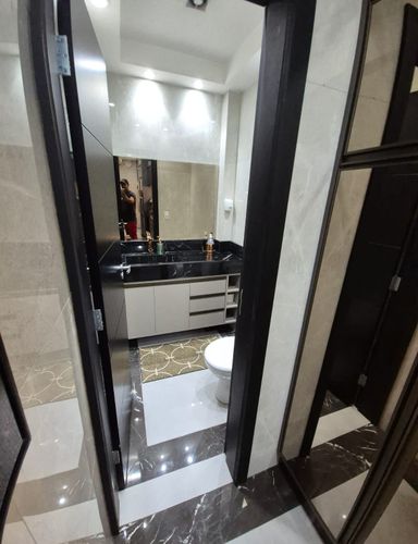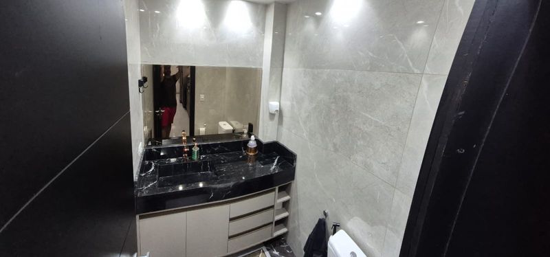 Primeiro Piso: Sala ampla para três ambientes, com um belíssimo porcelanato Portobello, projeto de iluminação personalizado e parede espelhada. O espaço está totalmente decorado com mesa para seis, sofá retrátil e reclinável e sistema de home theater com TV Oled de 65 polegadas.
